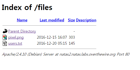해당 페이지에는 디렉토리 리스팅 취약점이 있는 것으로 확인 되었고, users.txt 파일을 조회해보면 다음 레벨의 패스워드를 얻을 수 있다.